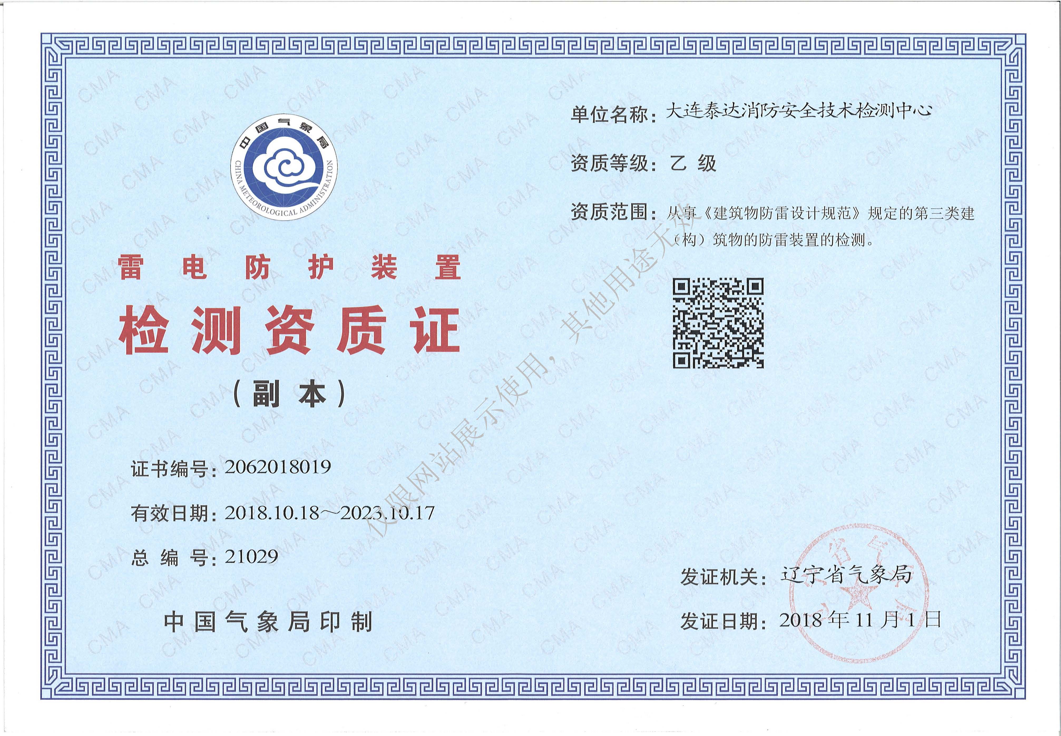 · 是經(jīng)“社會(huì)消防技術(shù)服務(wù)信息系統(tǒng)”備案并公示的消防技術(shù)服務(wù)機(jī)構(gòu),已取得中國(guó)氣象局頒發(fā)的雷電防護(hù)裝置檢測(cè)資質(zhì)證書、遼寧省質(zhì)量技術(shù)監(jiān)督局審核批準(zhǔn)的檢驗(yàn)檢測(cè)機(jī)構(gòu)資質(zhì)認(rèn)定證書(CMA)及包括消防檢測(cè)、電氣檢測(cè)、雷電防護(hù)裝置檢測(cè)、防火涂層厚度檢測(cè)等在內(nèi)的200余項(xiàng)檢驗(yàn)檢測(cè)能力,取得大連市應(yīng)急管理局頒發(fā)的安全生產(chǎn)標(biāo)準(zhǔn)化證書,獲得質(zhì)量管理體系、環(huán)境管理體系、職業(yè)健康安全管理體系認(rèn)證證書,是經(jīng)備案的高新技術(shù)企業(yè),可獨(dú)立出具具有證明作用的檢測(cè)報(bào)告。